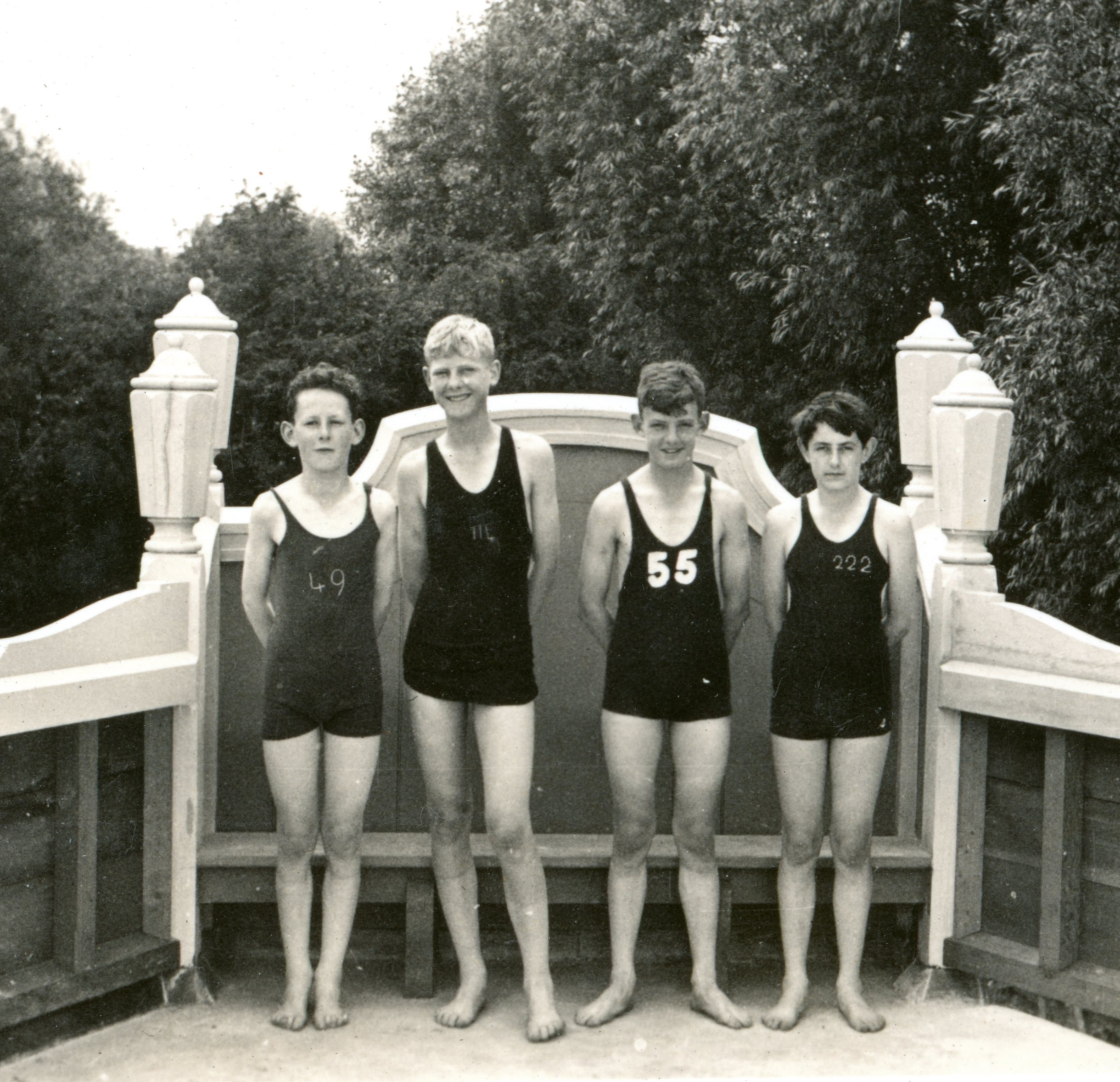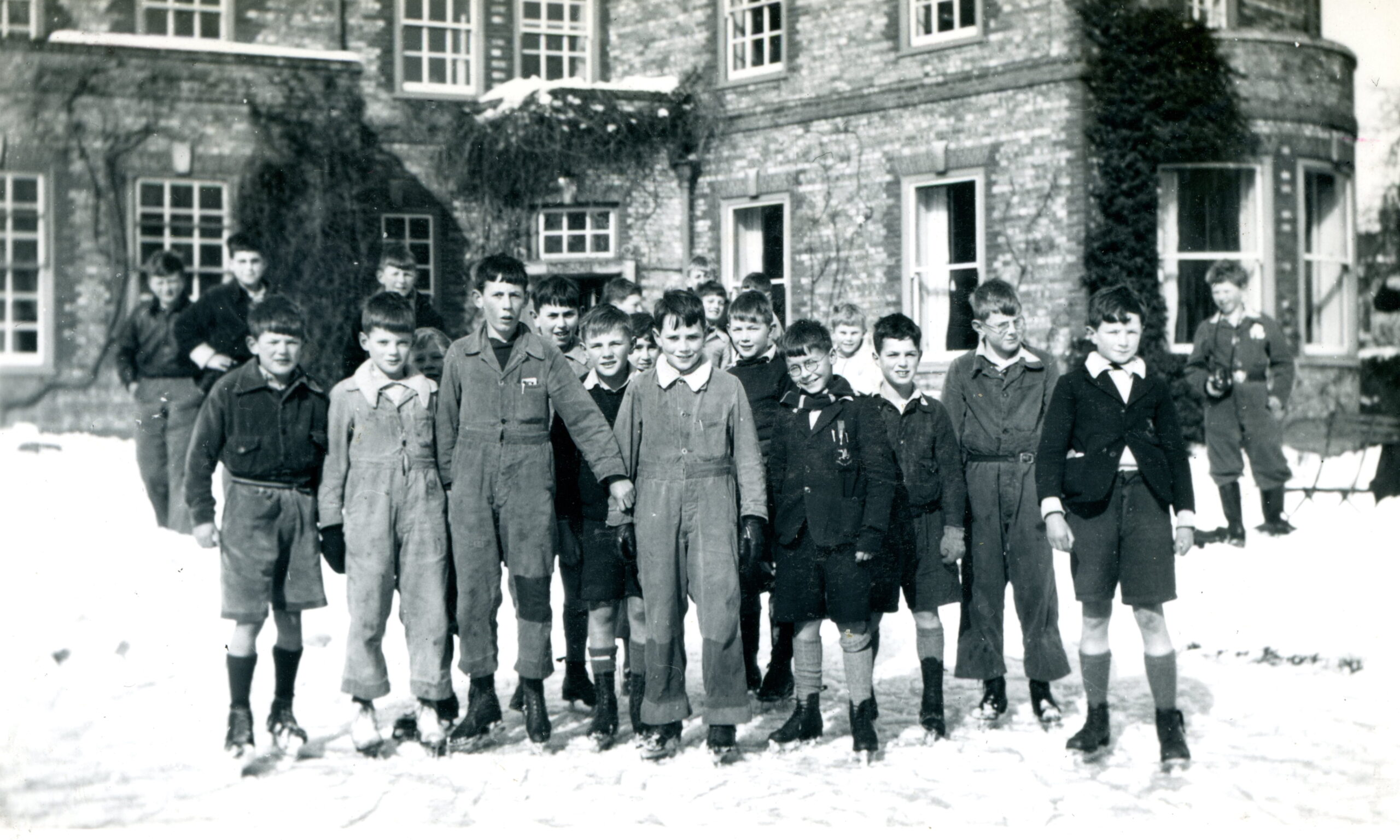 Skipper was keen that the children felt free to run and play outside. The summer uniform then (Photo 4) comprised bare legs, shorts, and belts, to keep the shirts tidy in 1934. Summer hats were grey, of soft fabric, but had to be worn by all in the heat. The few girls of that time were allowed to wear their own choice but with a blazer (Photo 5). The Barge on which the boys are standing (Photo 6) was built to hold the changing rooms below. Their knitted costumes of 1936 looked good when dry but most were wool and they would stretch badly when coming out of the water! Moving from the water to the ice (Photo 7). Skating on ice rinks was a popular Dragon winter sport. Here the boys are wearing the dungarees that many wore over their uniform from 1939 until well after the war was over. They had been made at home as so many uniforms were damaged by playing in the trees or field in rough play. Many were patched in various places.