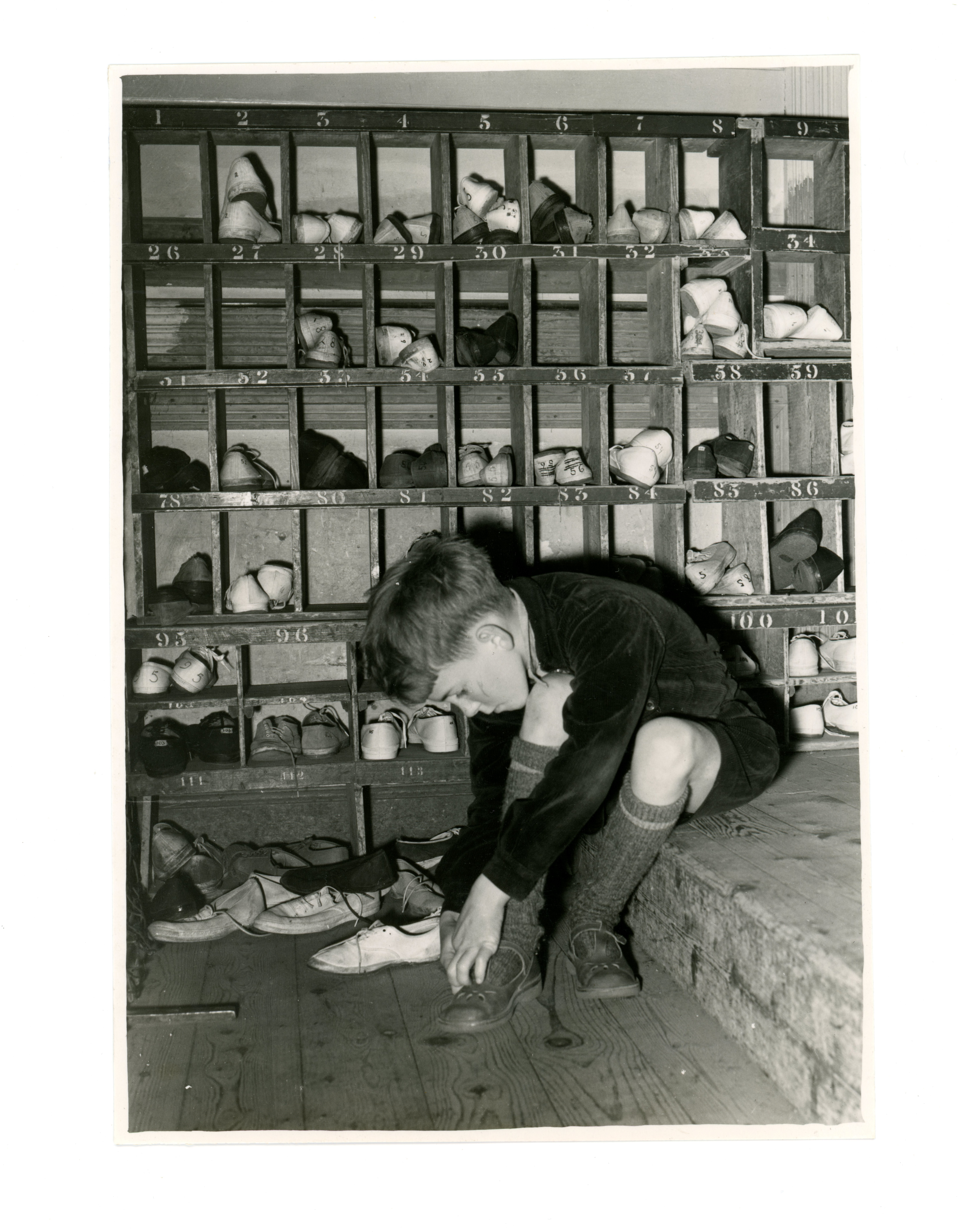 This boy (Photo 8) is changing into summer sandals, after playing cricket. The heavier laced shoes were kept for the winter. ‘Changers’ were always a continual difficulty for the staff as items were surreptitiously appropriated from another locker when a child’s locker was already empty. Difficulties with naming items were only solved when Cash’s name began to be available in 1846. This shoe locker was made of wood, whereas modern ‘changers’ now have metal wire cages. Lost individual shoes were very often found at the end of a term resting behind a radiator!